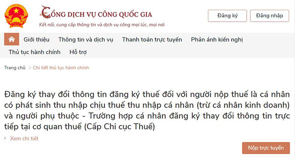 NNT truy cập vào Cổng Dịch vụ công Quốc gia, tìm kiếm thủ tục hành chính: “Thay đổi thông tin đăng ký thuế” hoặc truy cập vào đường dẫn: https://dichvucong.gov.vn/p/home/dvc-chi-tiet-thu-tuc-nganh-doc.html?ma_thu_tuc=1.010244