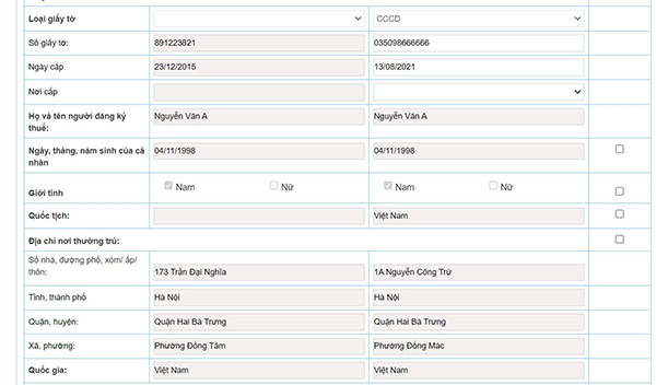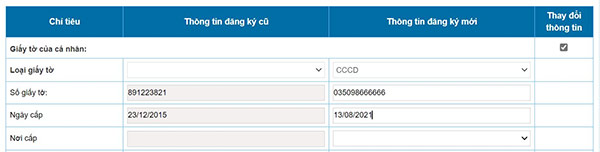 Tại mục Giấy tờ của cá nhân, NNT tích chọn “Thay đổi thông tin” và nhập chính xác thông tin số giấy tờ và ngày cấp theo CCCD mới nhất (12 số)