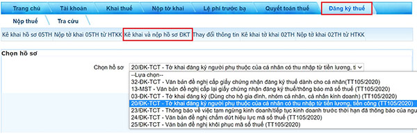 Sau khi đăng nhập thành công, tại thanh chức năng, tích chọn Đăng ký thuế\Kê khai và nộp hồ sơ ĐKT Chọn hồ sơ “20/ĐK-TCT-Tờ khai đăng ký NPT của cá nhân có thu nhập từ TLTC (TT105/2020)