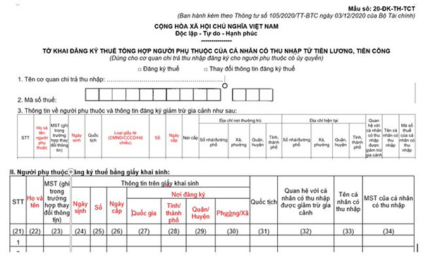 + Tờ khai đăng ký thuế mẫu số 20-ĐK-TCT ban hành kèm theo Thông tư số 105/2020/TT-BTC để thay đổi thông tin đăng ký thuế của người phụ thuộc.