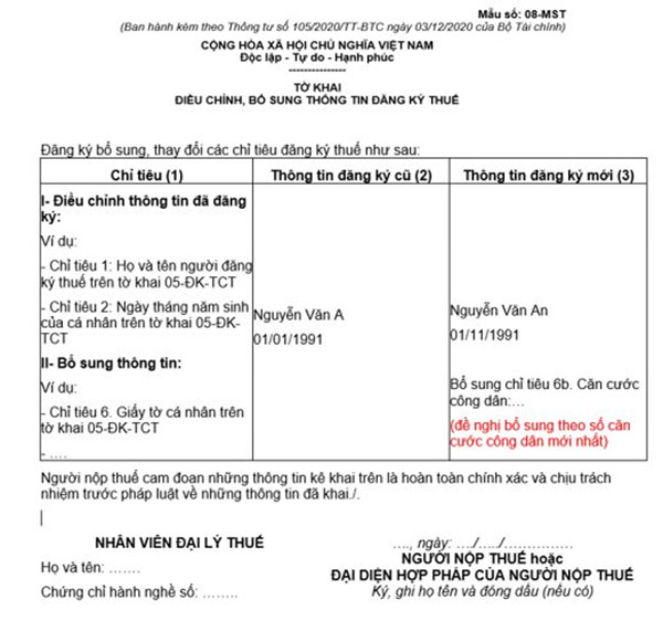+ Tờ khai điều chỉnh, bổ sung thông tin đăng ký thuế mẫu số 08-MST ban hành kèm theo Thông tư 105/2020/TT-BTC để kê khai thay đổi thông tin đăng ký thuế của bản thân NNT.