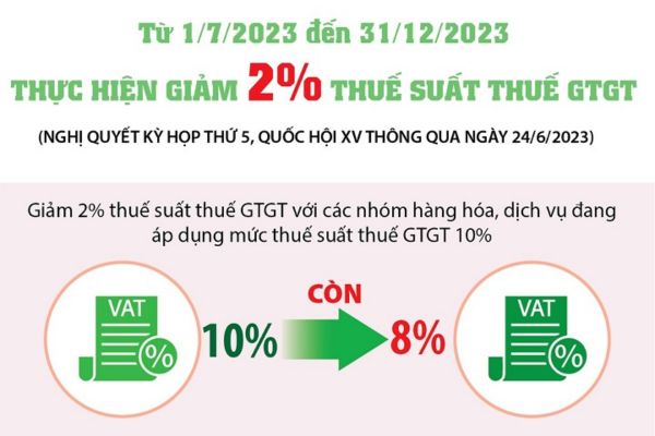 Chính sách giảm thuế GTGT xuống 8% từ ngày 01/7/2023 . Xemngay: Nghị quyết 43/2022/QH15 giảm thuế GTGT còn 8% từ 1/7/2023