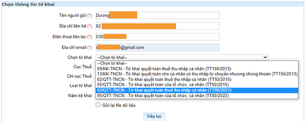 Lưu ý: Tại mục chọn tờ khai, vì đây là trường hợp bạn trực tiếp quyết toán thuế TNCN với cơ quan thuế nên bạn cần chọn tờ khai 02/QTT-TNCN - Tờ khai quyết toán thuế TNCN theo Thông tư 80/2021/TT-BTC.