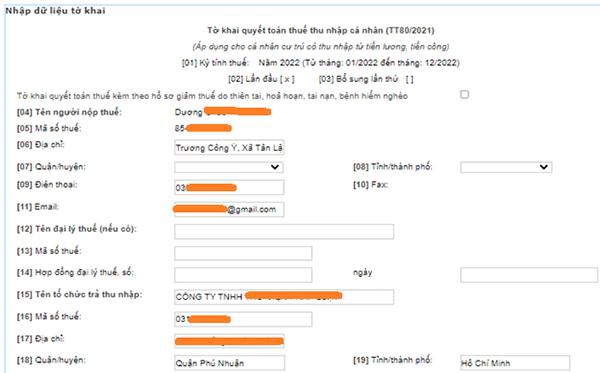 - Trường hợp 1: “Tích vào ô này nếu người nộp thuế có duy nhất 01 nguồn trực tiếp khai thuế trong năm do làm việc tại các tổ chức quốc tế, Đại sứ quán, Lãnh sự quán tại Việt Nam hoặc nguồn từ nước ngoài (không khấu trừ tại nguồn). Sau đó, người nộp thuế lựa chọn cơ quan thuế đã khai trực tiếp trong năm tại ô “Cục thuế” trực tiếp khai thuế trong năm. (Trường hợp cá nhân có duy nhất 1 nguồn thu nhập trực tiếp).