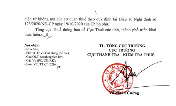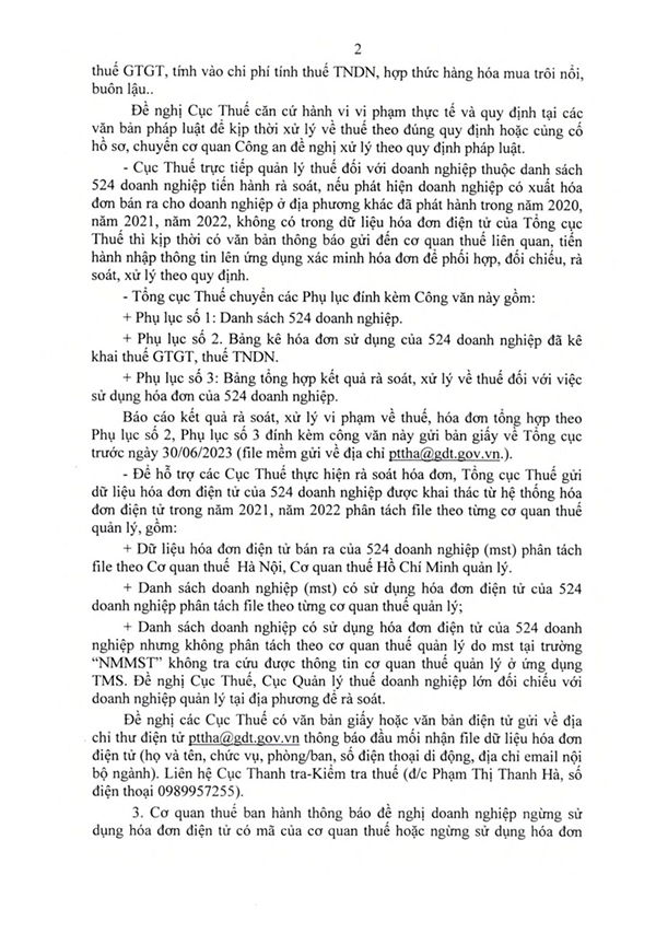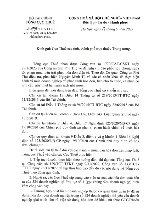 Tổng cục Thuế yêu cầu các Cục Thuế tập trung vào việc rà soát, xử lý vi phạm đối với các hóa đơn xuất bán ra của 524 doanh nghiệp có trong danh sách.