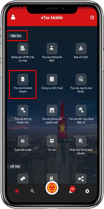 Bước 1: NNT tải app eTax Mobile trên App Store hoặc CH Play. NSD chọn phân hệ Tiện ích -> Tra cứu hộ kinh doanh (hỗ trợ cả đăng nhập và không đăng nhập)