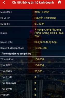 Bước 5: NSD chọn biểu tượng màu xanh nhạt, xem thông tin của một hộ kinh doanh đã chọn: Mã số thuế, tên người nộp thuế, ngành nghề, địa chỉ.