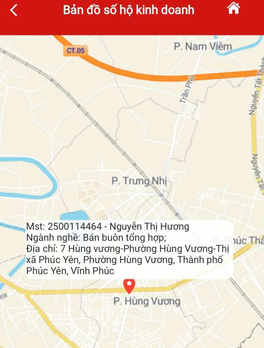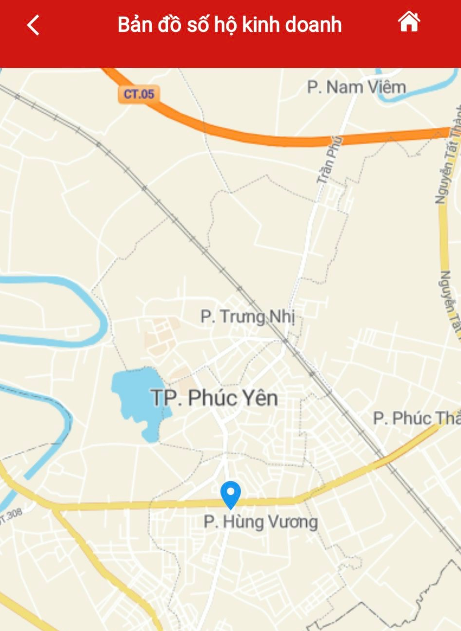 Bước 4.2: NSD chọn biểu tượng của 1 bản ghi, hệ thống hiển thị màn hình bản đồ số của hộ kinh doanh đã chọn.
