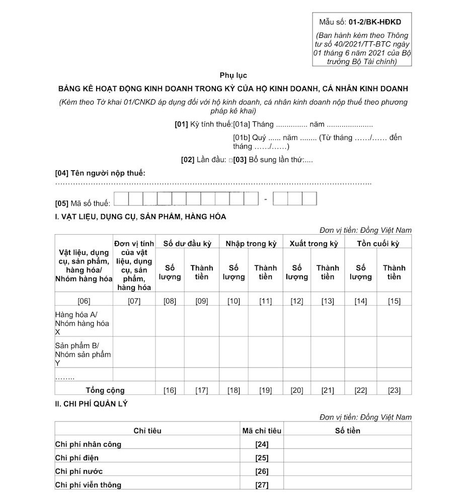 Theo điểm b khoản 1 Điều 11 Thông tư 40/2021/TT-BTC, phụ lục Bảng kê hoạt động kinh doanh trong kỳ của hộ, cá nhân kinh doanh (áp dụng đối với hộ, cá nhân kinh doanh nộp thuế theo phương pháp kê khai) theo mẫu số 01-2/BK-HĐKD ban hành kèm theo Thông tư 40/2021/TT-BTC. Trường hợp hộ, cá nhân kinh doanh nộp thuế theo phương pháp kê khai nếu có căn cứ xác định được doanh thu theo xác nhận của cơ quan chức năng thì không phải nộp Phụ lục Bảng kê mẫu số 01-2/BK-HĐKD.
