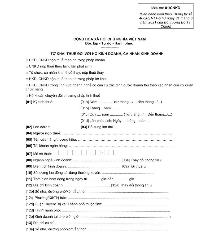 Mẫu tờ khai thuế đối với hộ kinh doanh, cá nhân kinh doanh là mẫu 01/CNKD được ban hành kèm Thông tư 40/2021/TT-BTC