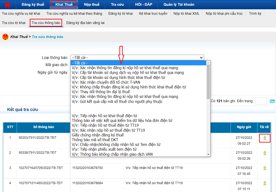 - Doanh nghiệp có thể nhấn vào tờ khai, thông báo cần xem và “Tải về”