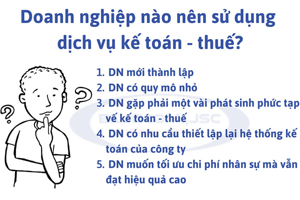 Kế toán - thuế dịch vụ là hình thức dịch vụ được nhiều doanh nghiệp lựa chọn để giải quyết các công việc liên quan đến kế toán và thuế. Những doanh nghiệp nên sử dụng dịch vụ này bao gồm:
