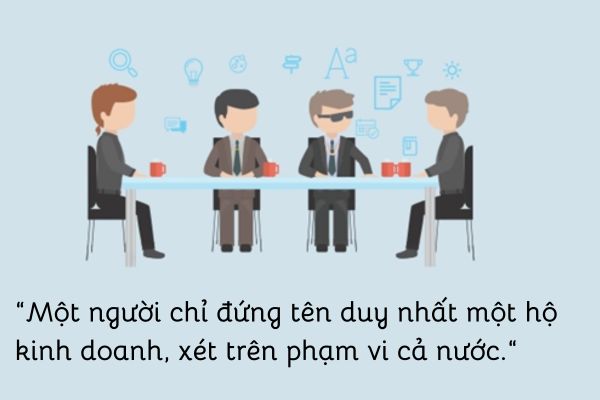 Một người chỉ đứng tên duy nhất một hộ kinh doanh, xét trên phạm vi cả nước. Nếu người này đã là chủ một hộ kinh doanh trước đó, mặc dù không kinh doanh từ rất lâu rồi nhưng vẫn chưa tiến hành giải thể thì người này không thể đứng tên trên hộ kinh doanh mới (muốn đăng ký hộ kinh doanh mới phải giải thể hộ kinh doanh cũ).