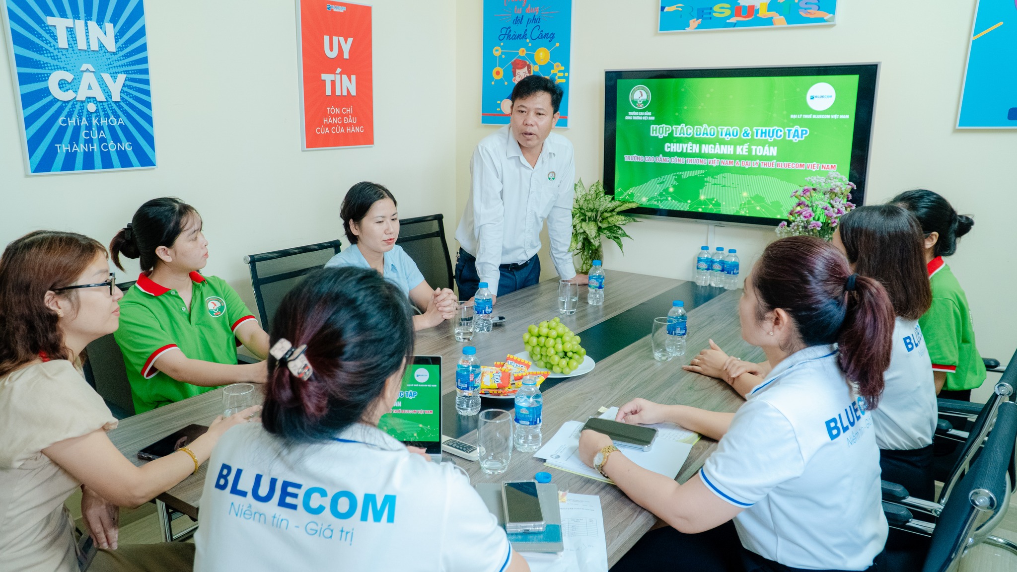 Chương trình hợp tác đào tạo này diễn ra trong vòng 3 tháng nhưng đã nhanh chóng đạt được những kết quả đáng ghi nhận. Công ty Bluecom là một trong những doanh nghiệp hàng đầu trong lĩnh vực dịch vụ thuế và kế toán tại Việt Nam. Với đội ngũ chuyên gia giàu kinh nghiệm, công ty không chỉ đảm nhận vai trò hỗ trợ đào tạo mà còn cung cấp môi trường thực hành cho sinh viên, giúp các em có cơ hội trực tiếp trải nghiệm những công việc liên quan đến lĩnh vực kế toán - tài chính.