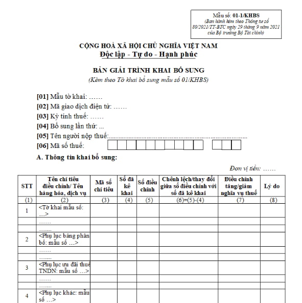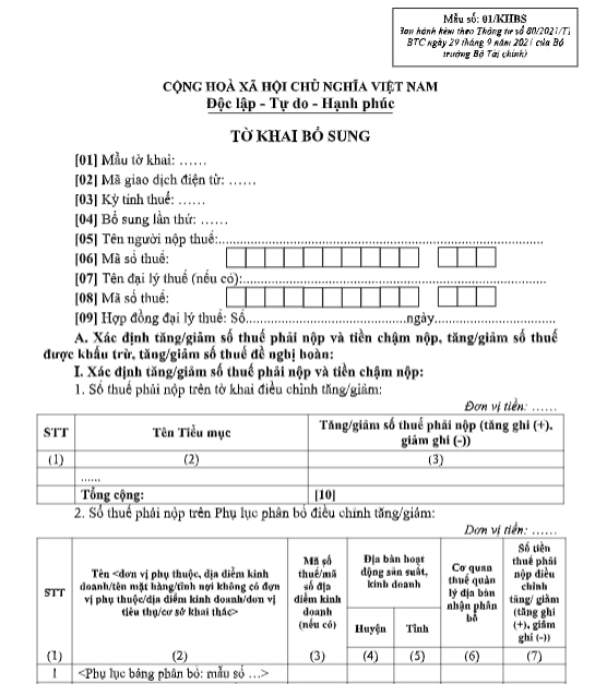 - Tờ khai bổ sung theo Mẫu 01/KHBS ban hành kèm theo Thông tư 80/2021/TT-BTC: