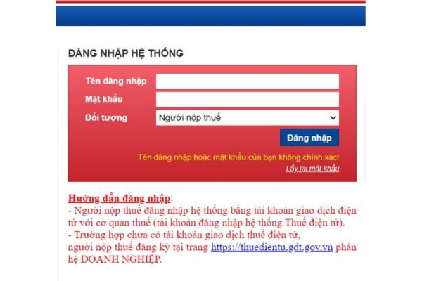 Người nộp thuế sẽ gặp trường hợp thông báo “sai mật khẩu” như hình trên đây. Việc đầu tiên người nộp thuế cần làm đó là kiểm tra mật khẩu bạn nhập đã đúng chưa. Nếu đúng với mật khẩu bạn khởi tạo nhưng không đăng nhập được thì bạn có thể sử dụng chức năng “lấy lại mật khẩu” phía dưới phần đăng nhập.
