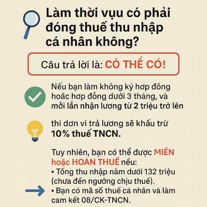 Lao động thời vụ không nằm ngoài phạm vi điều chỉnh của Luật Thuế thu nhập cá nhân. Việc phải nộp thuế hay không phụ thuộc vào mức thu nhập, thời gian làm việc và hình thức hợp đồng.