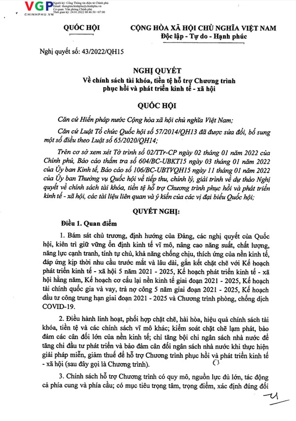 Đồng thời, đề nghị Chính phủ báo cáo Quốc hội tại Kỳ họp thứ 6 kết quả thực hiện chính sách giảm 2% thuế giá trị gia tăng cùng với kết quả thực hiện Nghị quyết số 43 để Quốc hội xem xét, quyết định bổ sung các giải pháp hỗ trợ phục hồi và phát triển kinh tế nếu có.
