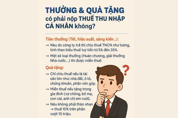 Thuế thu nhập cá nhân (TNCN) là một trong những loại thuế phổ biến và có ảnh hưởng trực tiếp đến thu nhập của người lao động, cá nhân kinh doanh và nhiều đối tượng khác. Bên cạnh các khoản thu nhập từ tiền lương, tiền công hay hoạt động sản xuất kinh doanh, thì thu nhập từ tiền thưởng và quà tặng cũng là những khoản có thể chịu thuế TNCN. Tuy nhiên, không phải ai cũng hiểu rõ về cách tính, quy định miễn giảm và các thủ tục kê khai đối với loại thu nhập này.