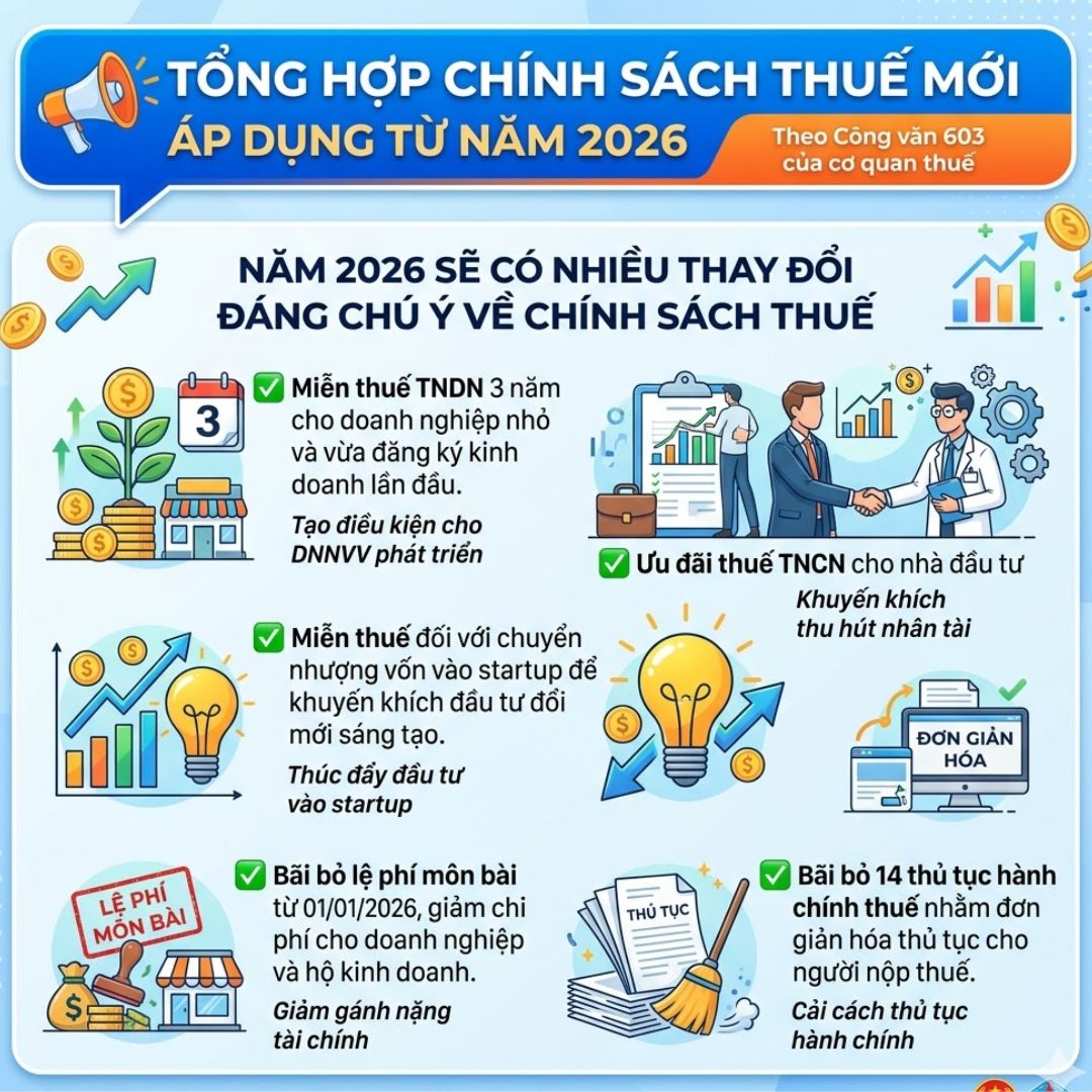 Năm 2026 đánh dấu nhiều thay đổi quan trọng trong hệ thống pháp luật thuế tại Việt Nam. Nhằm giúp người nộp thuế nắm bắt kịp thời các quy định mới, cơ quan thuế đã ban hành Công văn 603 để tổng hợp các chính sách thuế đáng chú ý sẽ áp dụng trong năm 2026.